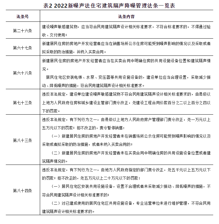 2022新噪声法中,将居住建筑(主要含住宅)列为需要保持安静的噪声敏感建筑物(见第八十八条),并对开发商提出了制度规定可操作性极强的、以隔声降噪标准为依据的、附带有明确法律责任的闭环管理要求,将对法规施行后住宅建筑的声环境保障产生立竿见影的深远影响。表1给出了新噪声法对开发商的具体规定。表2列出了新噪声法住宅建筑隔声降噪相关法条。